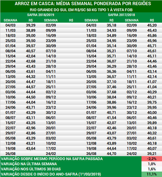 Arroz em casca: média semanal dos preços no RS