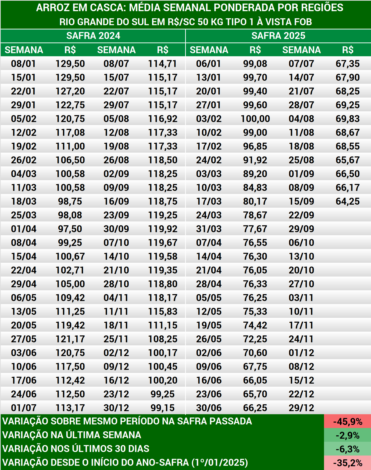 Arroz em casca: média semanal preços produtores