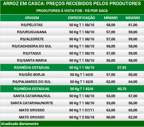 Arroz em casca: preços aos produtores por região