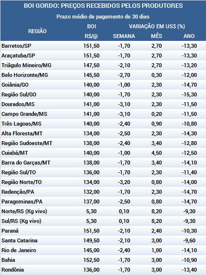 A escala dos frigoríficos atende em média a três dias úteis. O setor pecuário vive um impasse, visto a inconsistência na demanda por carne. Só há indicações de preços maiores para a arroba em ocasiões pontuais, para atender determinados mercados externos mais exigentes, como China e alguns países árabes. Em Goiás, a oferta é limitada e o boi gordo está cotado a R$ 138,00 por arroba à vista e a R$ 140,00 por arroba a prazo. Em Rondônia, a cotação é de R$ 133,00 por arroba à vista, e no Acre, R$ 127,50 por /arroba à vista. Em São Paulo, no atacado, a lentidão no escoamento mantém os preços estáveis. A carcaça casada de boi castrado está cotada a R$ 9,76 por Kg.
