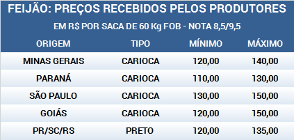 Em São Paulo, nesta primeira quinzena de dezembro, os preços do feijão carioca ao produtor estão entre R$ 130,00 a R$ 150,00 por saca de 60 Kg para o produto de melhor qualidade, contra R$ 100,00 a R$ 110,00 por saca de 60 Kg na segunda quinzena de novembro. Em Minas Gerais e em Goiás, os preços pagos aos produtores para o feijão de melhor qualidade estão entre R$ 120,00 a R$ 140,00 por saca de 60 Kg, contra R$ 100,00 a R$ 110,00 por saca de 60 Kg na segunda quinzena de novembro. No mercado de feijão preto, nesta primeira quinzena de dezembro, os preços aos produtores estão entre R$ 120,00 a R$ 135,00 por saca de 60 Kg, contra R$ 110,00 a R$ 130,00 na segunda quinzena do mês de novembro.