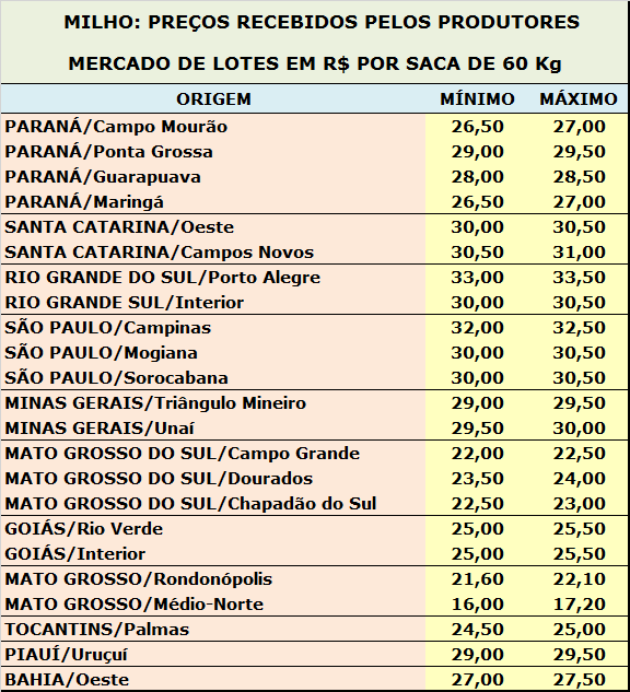 No Paraná, após um mês segurando lotes de milho da safra 2016/2017 na expectativa de que os preços aumentassem, os produtores se veem obrigados a negociar o produto a fim de liberar os silos para a soja que em breve será colhida no Estado. Na região norte, o ritmo da negociação está um pouco maior. Há registro de negócios a R$ 27,00 por saca de 60 Kg, para retirada imediata e pagamento em 2 de março, valor estável nos últimos dias. A procura de indústrias e granjas por milho também registra alta. A tendência é de que o volume de ofertas continue aumentando, devido à proximidade da colheita do grão. Na região de Cascavel, a indicação de compra é de R$ 26,50 por saca de 60 Kg, para retirada imediata e pagamento em 30 dias.