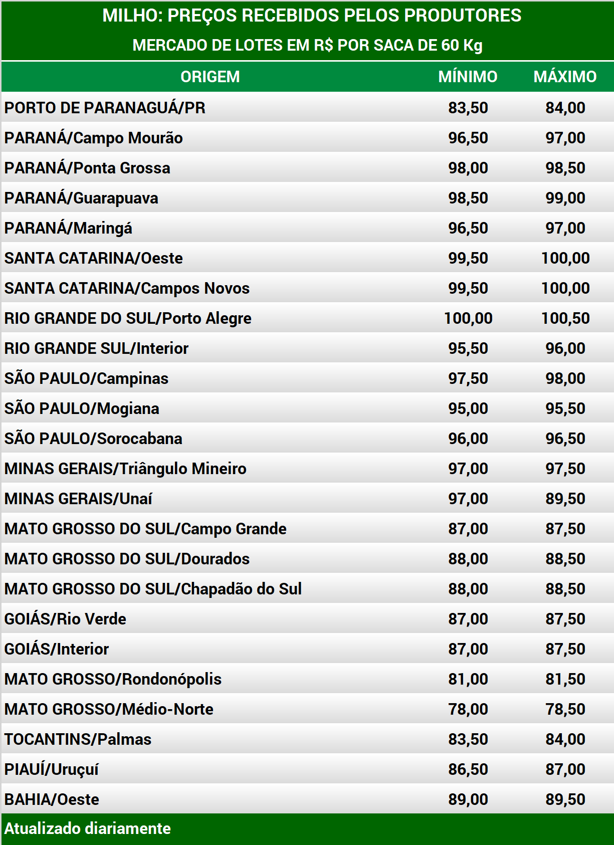 Em Mato Grosso, na região de Sorriso, os consumidores domésticos abastecidos indicam atualmente preços inferiores aos de 15 dias atrás, o que mantém os vendedores distantes do mercado. Os comerciantes, que costumam vender milho para compradores da Região Sul, indicam entre R$ 70,00 e R$ 71,00 por saca de 60 Kg FOB, para embarque entre agosto e setembro e pagamento com prazos variáveis, mais no curto prazo ou no fim de outubro. As usinas de etanol indicam entre R$ 69,00 e R$ 70,00 por saca de 60 Kg FOB, para embarque em setembro e pagamento no dia 30 do mesmo mês.
