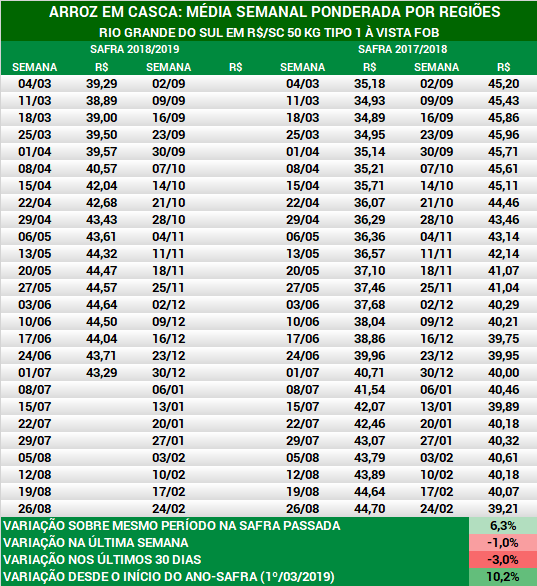 Arroz em casca: média semanal dos preços no RS