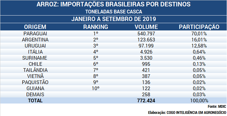ARROZ IMPORTAÇÕES JANEIRO-SETEMBRO 2019