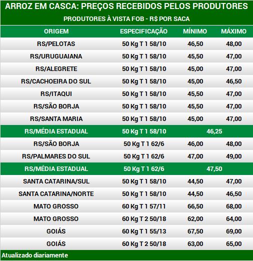 Arroz em casca: preços aos produtores por região