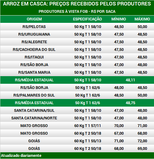 Arroz em casca: preços aos produtores por região