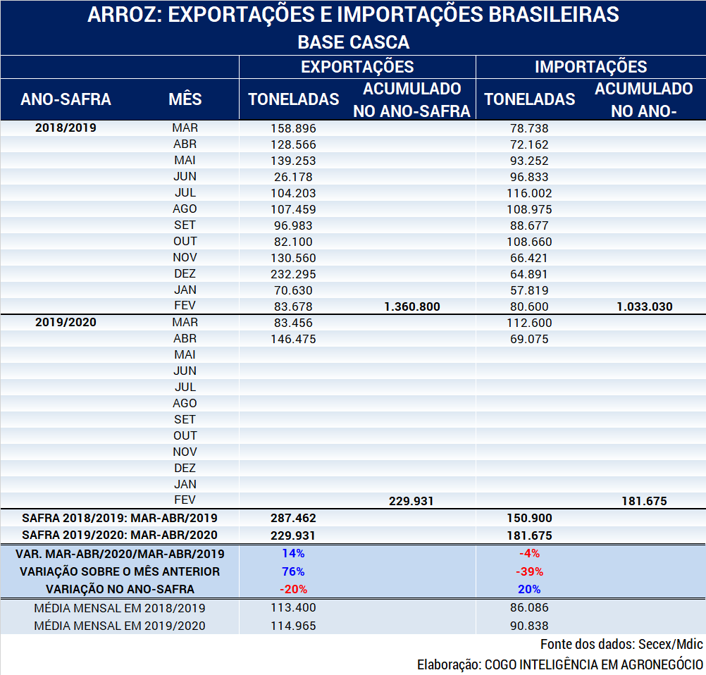 Em abril de 2020, o segundo mês do ano-safra 2019/2020, que iniciou em 1º de março de 2020 e se encerra em 28 de fevereiro de 2021, as exportações brasileiras de arroz atingiram 146.475 toneladas (base casca), 14% acima do mesmo mês do ano-safra anterior (abril/2019). Em relação ao mês anterior (março/2020), as exportações cresceram expressivos 76%. Em abril/2020, os embarques de arroz em casca responderam por apenas 0,1% do total. As exportações de produto beneficiado responderam por 55,3% das vendas externas e as de quebrados de arroz, por 44,6% do total embarcado em março/2020.