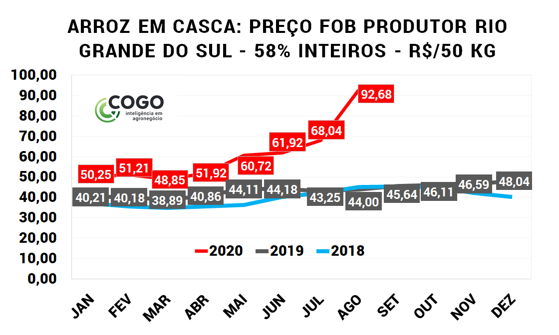 O preço médio do arroz em casca, FOB produtor, no Rio Grande do Sul, para o produto longo fino, tipo 1, com média de 58% de grãos inteiros, é de R$ 92,68 por saco de 50 Kg, acumulando altas de 40,6% nos últimos 30 dias e de 108,9% nos últimos 12 meses. Esse é o maior valor médio recebido pelos produtores de arroz em casca, no Rio Grande do Sul, tanto em termos nominais, quanto em termos reais. A tendência é de alta dos preços do arroz em casca ao produtor ao longo deste segundo semestre, diante do consumo interno aquecido, ritmo aquecido das exportações brasileiras e recuo das importações, com projeção de escassez de oferta no mercado interno até o final de 2020. Com o viés de alta, os produtores estão retraídos, aguardando a evolução dos preços, na expectativa de novos reajustes nas próximas semanas.