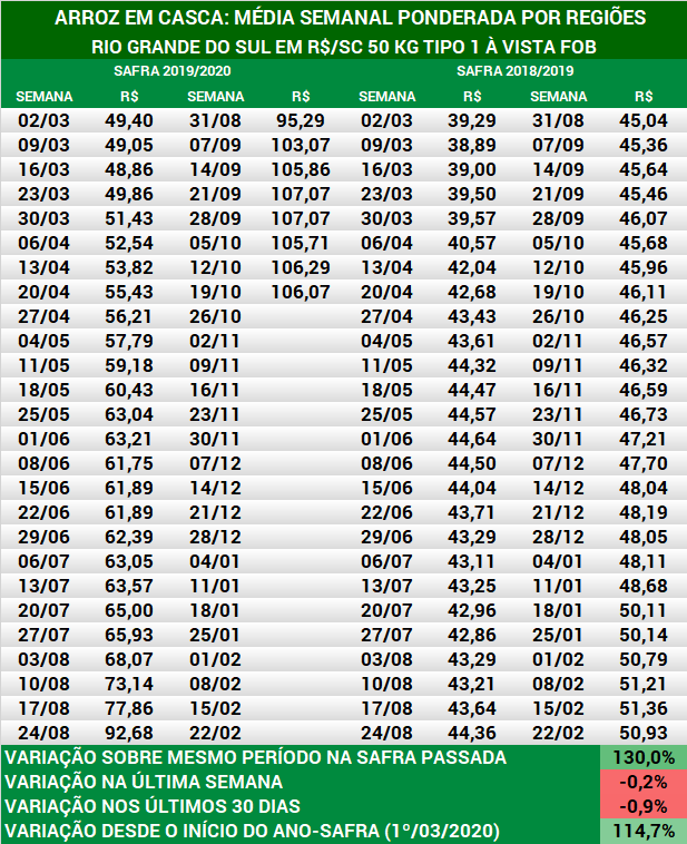 Arroz em casca: média semanal dos preços no RS