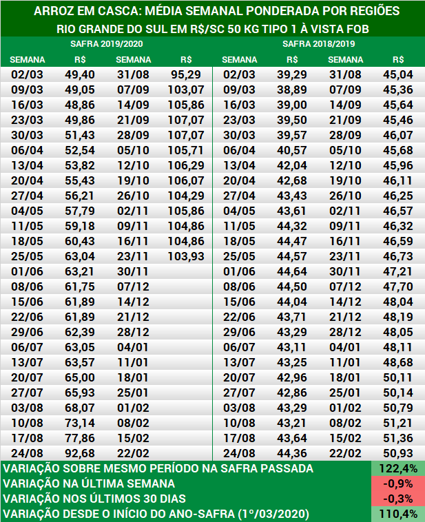 Arroz em casca: média semanal dos preços no RS