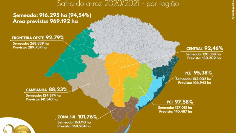 Os números atualizados das regiões produtos são os seguintes: Zona Sul, com 101,76% (163.110 hectares semeados de um total de 160.284 hectares previstos); Planície Costeira Interna, com 97,58% (137.081 hectares de 140.487 hectares); Planície Costeira Externa, 95,38% (102.002 hectares de 106.942 hectares previstos); Fronteira Oeste, 92,79% (268.839 hectares de 289.737 hectares); Central, 92,46% (120.388 hectares de 130.202 hectares); Campanha, com 88,23% (124.874 hectares de 141.540 hectares). Salienta-se que os números da Fronteira Oeste não foram atualizados por um problema técnico. Fonte: Irga. Adaptado por Cogo Inteligência em Agronegócio.