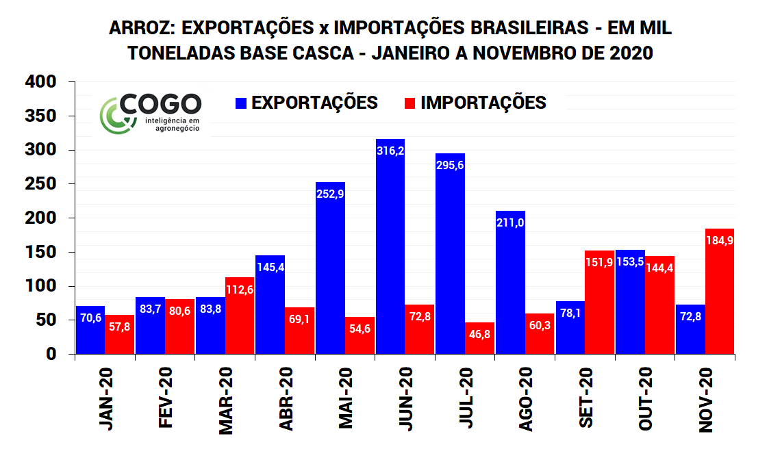 Em novembro de 2020, o 9º mês do ano-safra 2019/2020, que iniciou em 1º de março de 2020 e se encerra em 28 de fevereiro de 2021, as exportações brasileiras de arroz recuaram para 72.753 toneladas base casca, 44% abaixo do volume embarcado no mesmo mês do ano anterior (novembro/2019) e 53% inferiores aos embarques do mês anterior (outubro/2020), que atingiram 153.141 toneladas base casca.