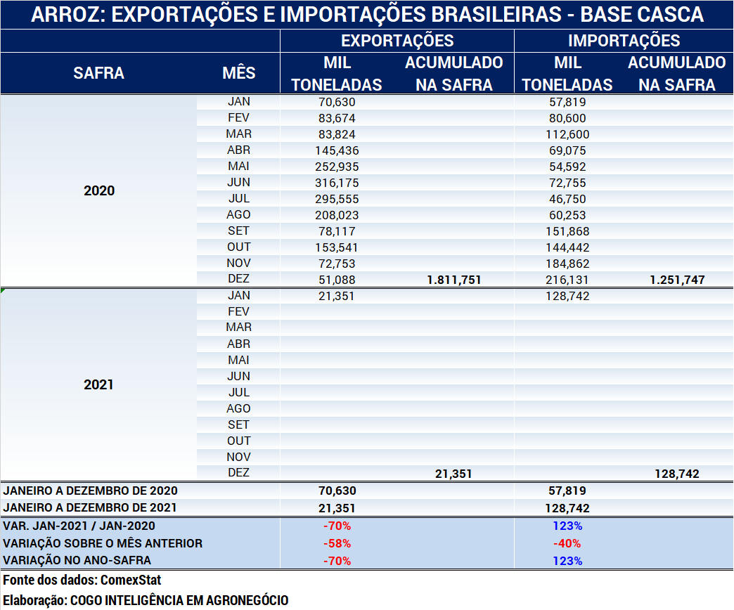 No acumulado do ano-safra 2020 (1º a 31 de janeiro de 2021), as importações brasileiras de arroz atingiram 128.742 toneladas (base casca), 123% acima do mesmo período do ano-safra anterior. No mesmo período, foram exportadas pelo Brasil apenas 21.351 toneladas base casca, 70% abaixo do volume embarcado no mesmo mês do ano anterior (janeiro/2020). Isso gerou um déficit na balança comercial do arroz de 107 mil toneladas (base casca) neste ano-safra 2021. Na safra passada, entre janeiro e dezembro de 2020, o Brasil exportou 1,812 milhão de toneladas (base casca) e importou 1,252 milhão de toneladas (base casca), com superávit na balança comercial do arroz de 560 mil toneladas (base casca). Fonte dos dados: ComexStat. Elaborado por Cogo Inteligência em Agronegócio.