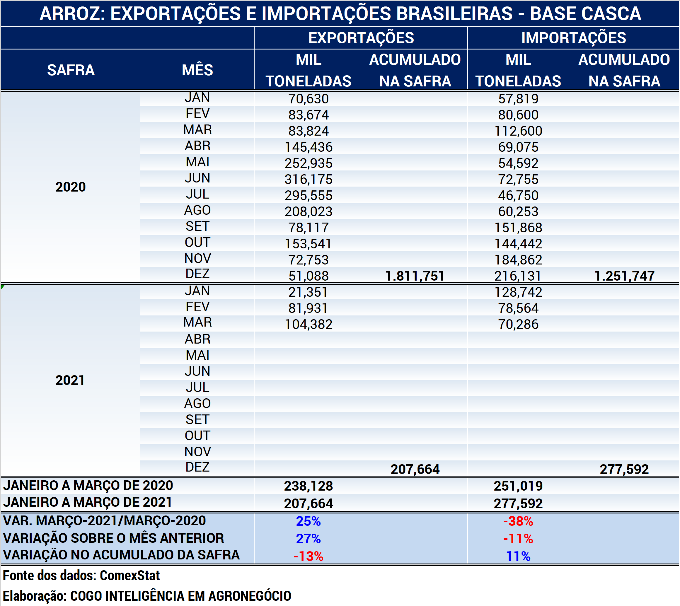 No acumulado do ano-safra 2021 (1º de janeiro a 31 de março de 2021), as importações brasileiras de arroz atingiram 277.592 toneladas (base casca), 11% acima do mesmo período do ano-safra anterior. No mesmo período, foram exportadas pelo Brasil 207.664 toneladas base casca, 13% abaixo do volume embarcado no mesmo mês período do ano anterior. Isso gerou um déficit na balança comercial do arroz de 69.928 toneladas (base casca) neste primeiro trimestre de 2021. Na safra passada, entre janeiro e dezembro de 2020, o Brasil exportou 1,812 milhão de toneladas (base casca) e importou 1,252 milhão de toneladas (base casca), com superávit na balança comercial do arroz de 560 mil toneladas (base casca). Fonte dos dados: ComexStat. Elaborado por Cogo Inteligência em Agronegócio.