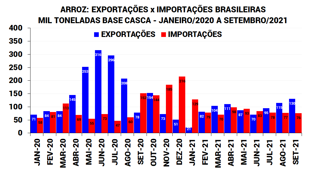 Em setembro de 2021, o 9º mês do ano-safra 2021, que iniciou em 1º de janeiro de 2021 e se encerra em 31 de dezembro de 2021, as exportações brasileiras de arroz atingiram o melhor resultado do ano, com embarques de 130.243 toneladas base casca, 67% acima do volume exportado no mesmo mês do ano anterior (setembro/2020) e 14% acima dos embarques do mês anterior (agosto/2021). No acumulado de janeiro a setembro de 2021, as exportações brasileiras de arroz atingiram 815.477 toneladas (base casca), 47% abaixo do mesmo intervalo do ano anterior (1.534.369 toneladas).