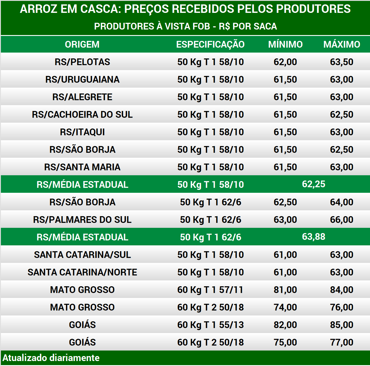 Arroz em casca: preços aos produtores por região