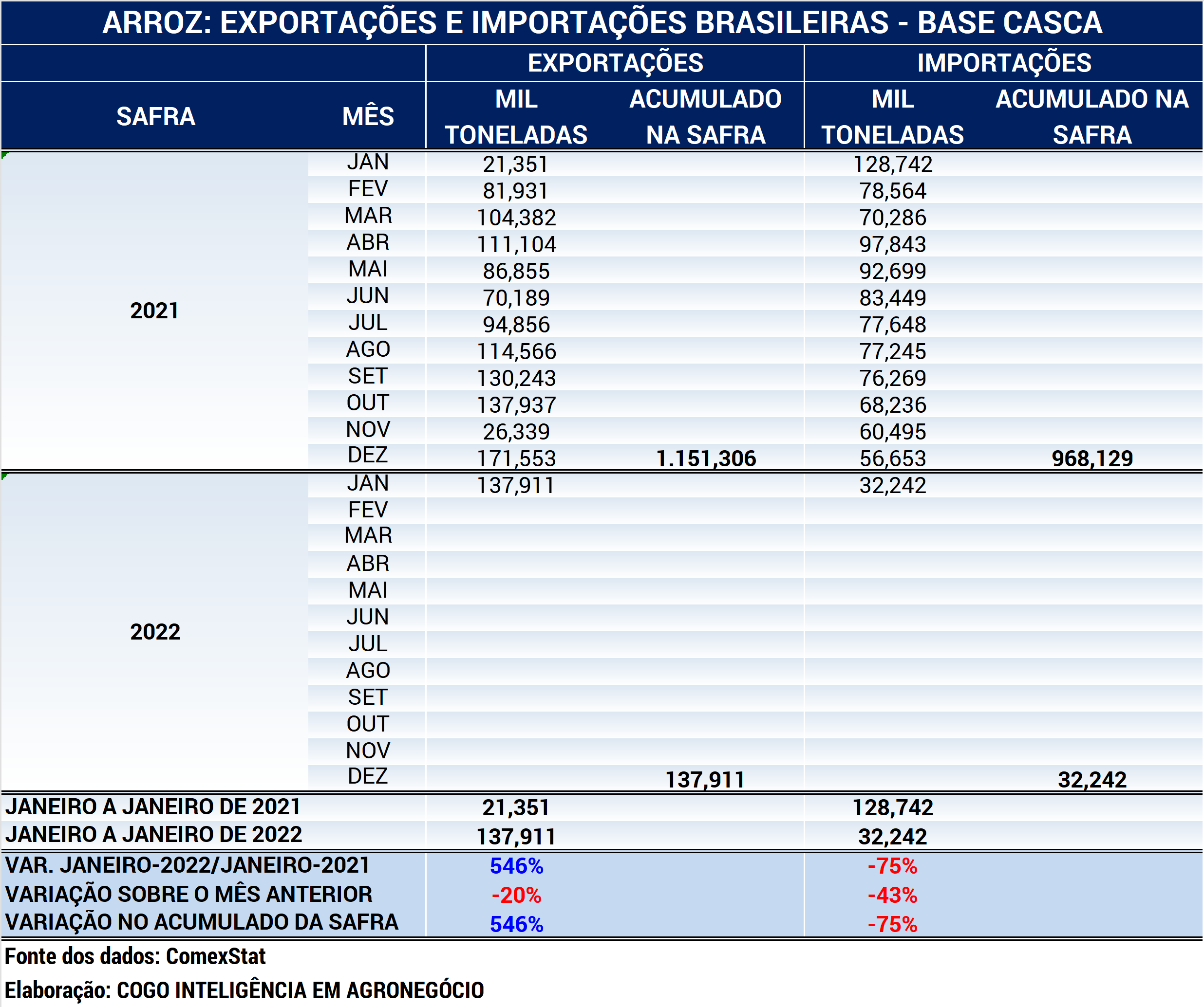 A balança comercial do arroz inicia o novo ano-safra 2022 com superávit. Em janeiro/2022, o 1º mês do ano-safra 2022, que iniciou em 1º de janeiro de 2022 e se encerra em 31 de dezembro de 2022, as exportações brasileiras de arroz atingiram 137.911 toneladas (base casca). No mesmo período, as importações brasileiras de arroz atingiram apenas 32.242 toneladas (base casca), com um forte recuo de 75% ante o mesmo mês do ano-safra anterior (janeiro/2021). Com isso, no primeiro mês do ano-safra 2022, o superávit na balança comercial do arroz é de 105.669 toneladas (base casca).