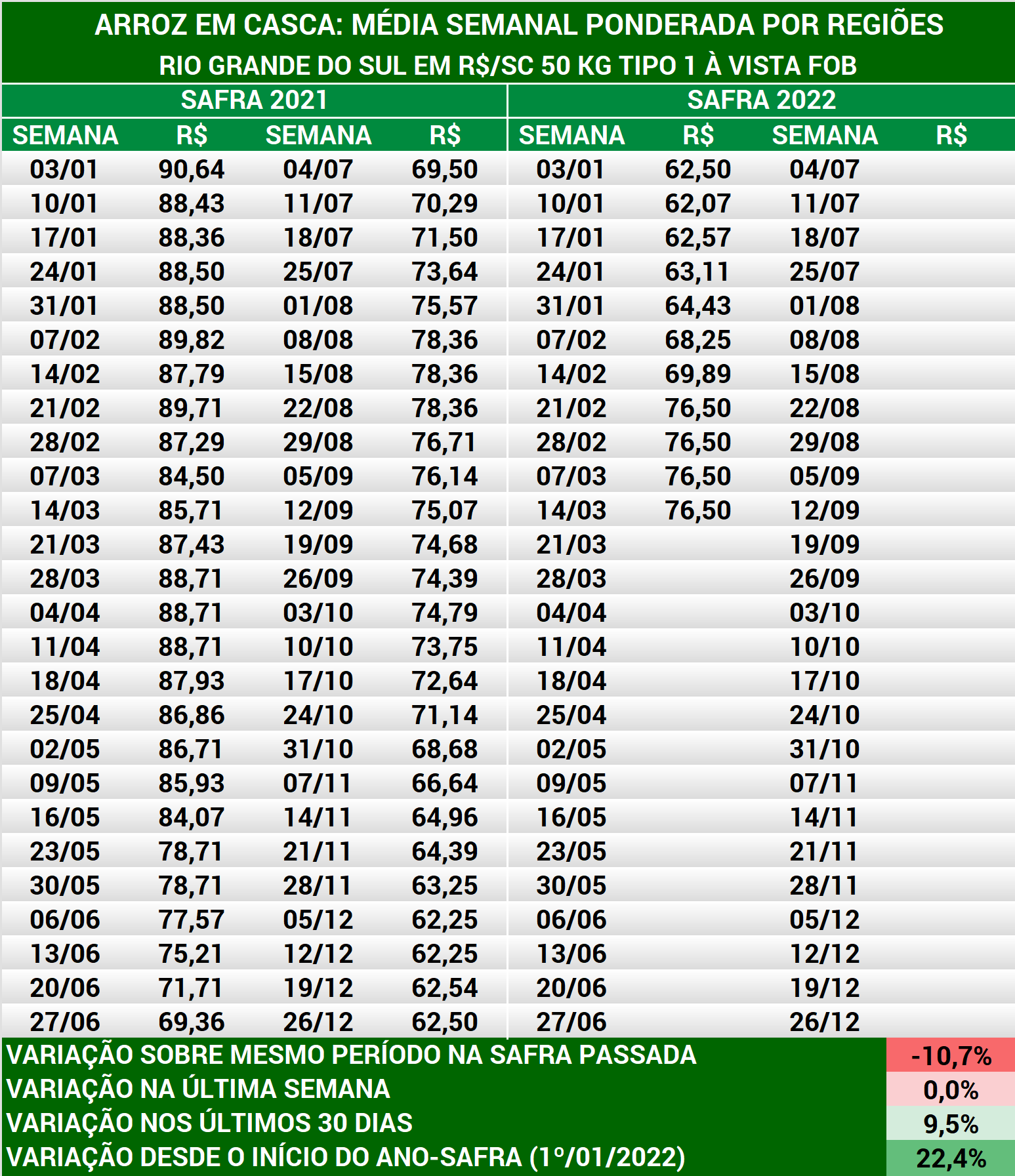 Arroz em casca: médias semanais preço produtor