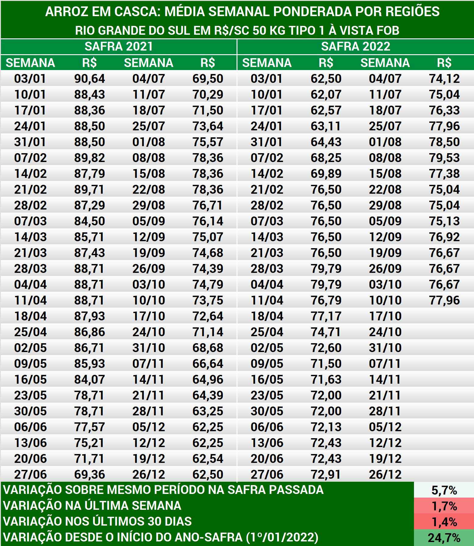 Arroz em casca: médias semanais preços produtor