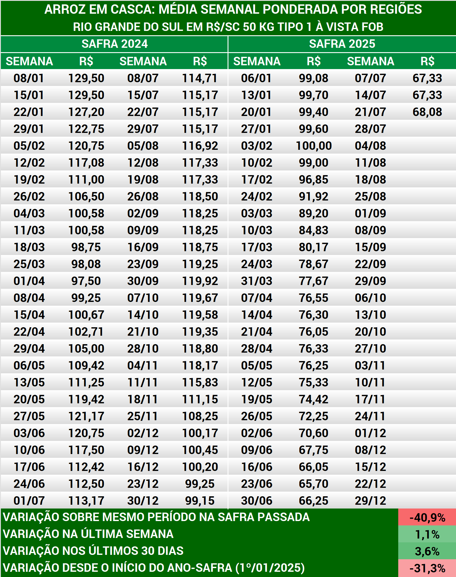 Arroz em casca: média semanal preços produtores