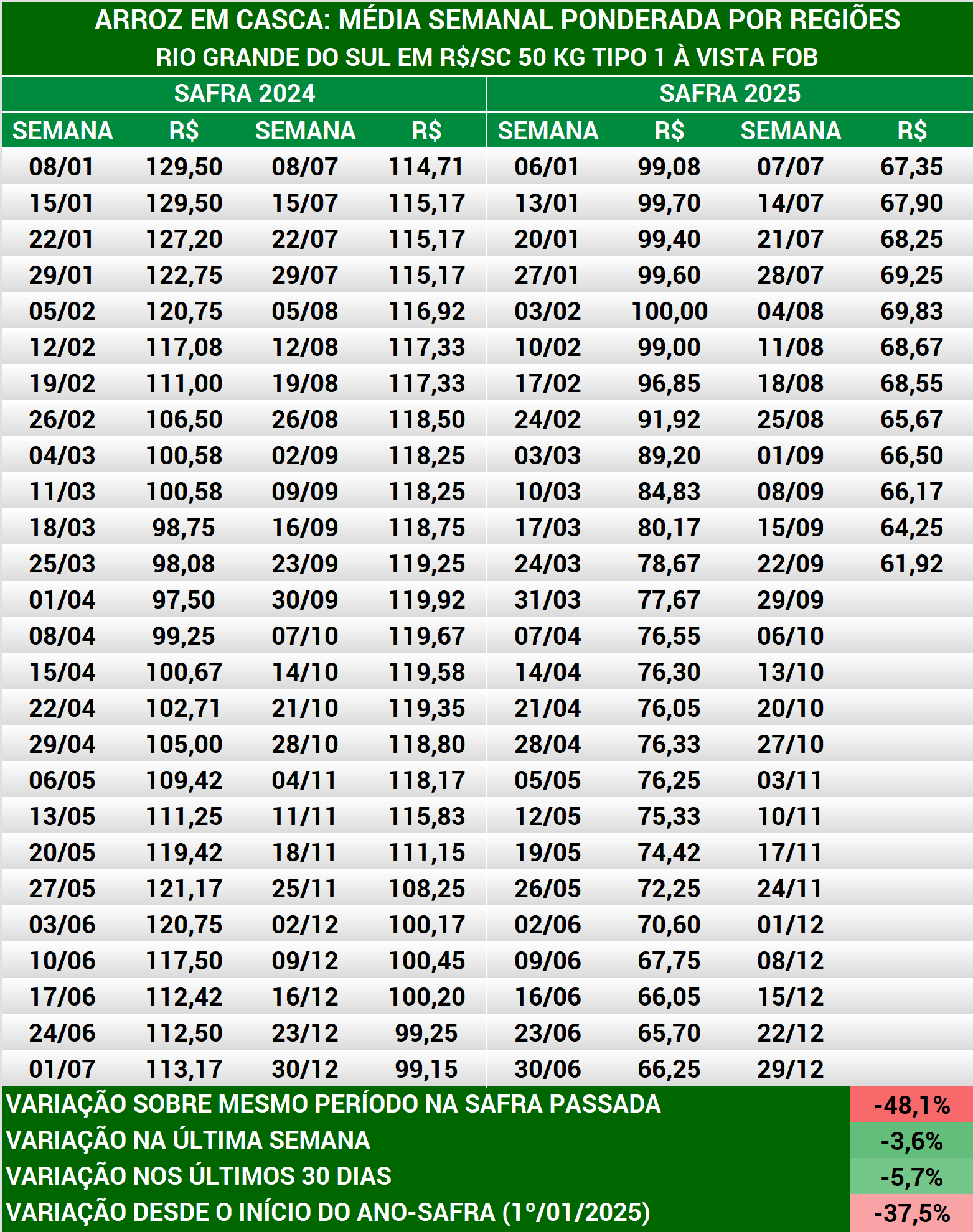 Arroz em casca: média semanal preços produtores