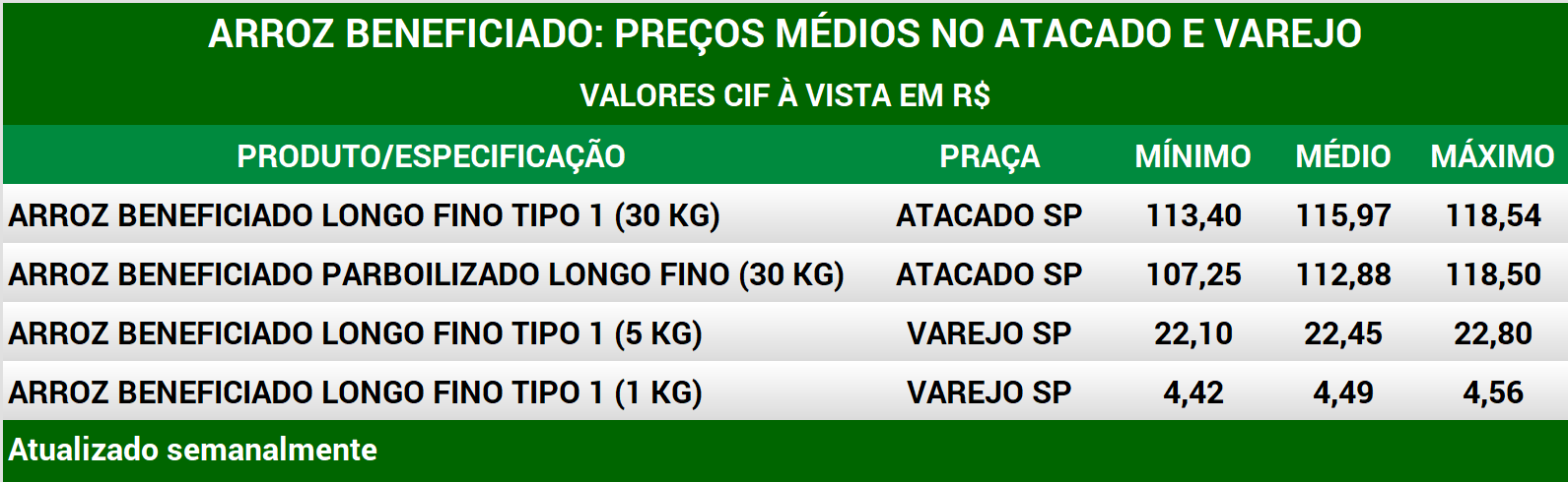 Arroz beneficiado: preços no atacado e no varejo