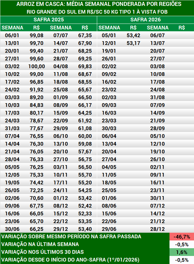 Arroz em casca: média semanal preços produtores
