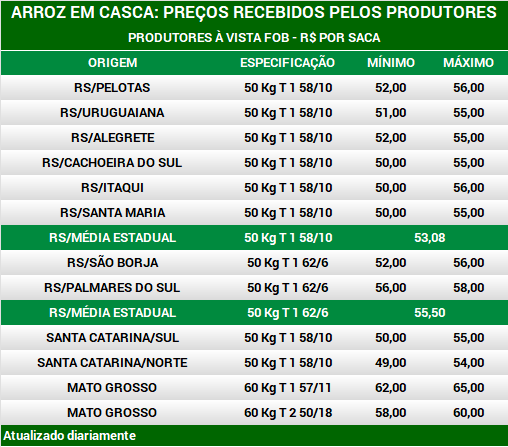 Arroz em casca: preços aos produtores por região