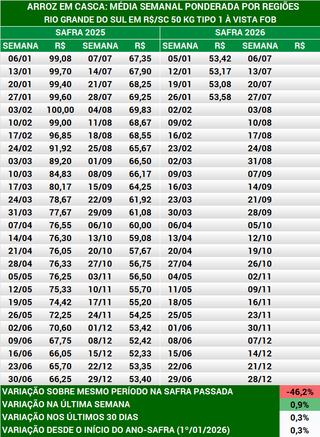 Arroz em casca: média semanal preços produtores