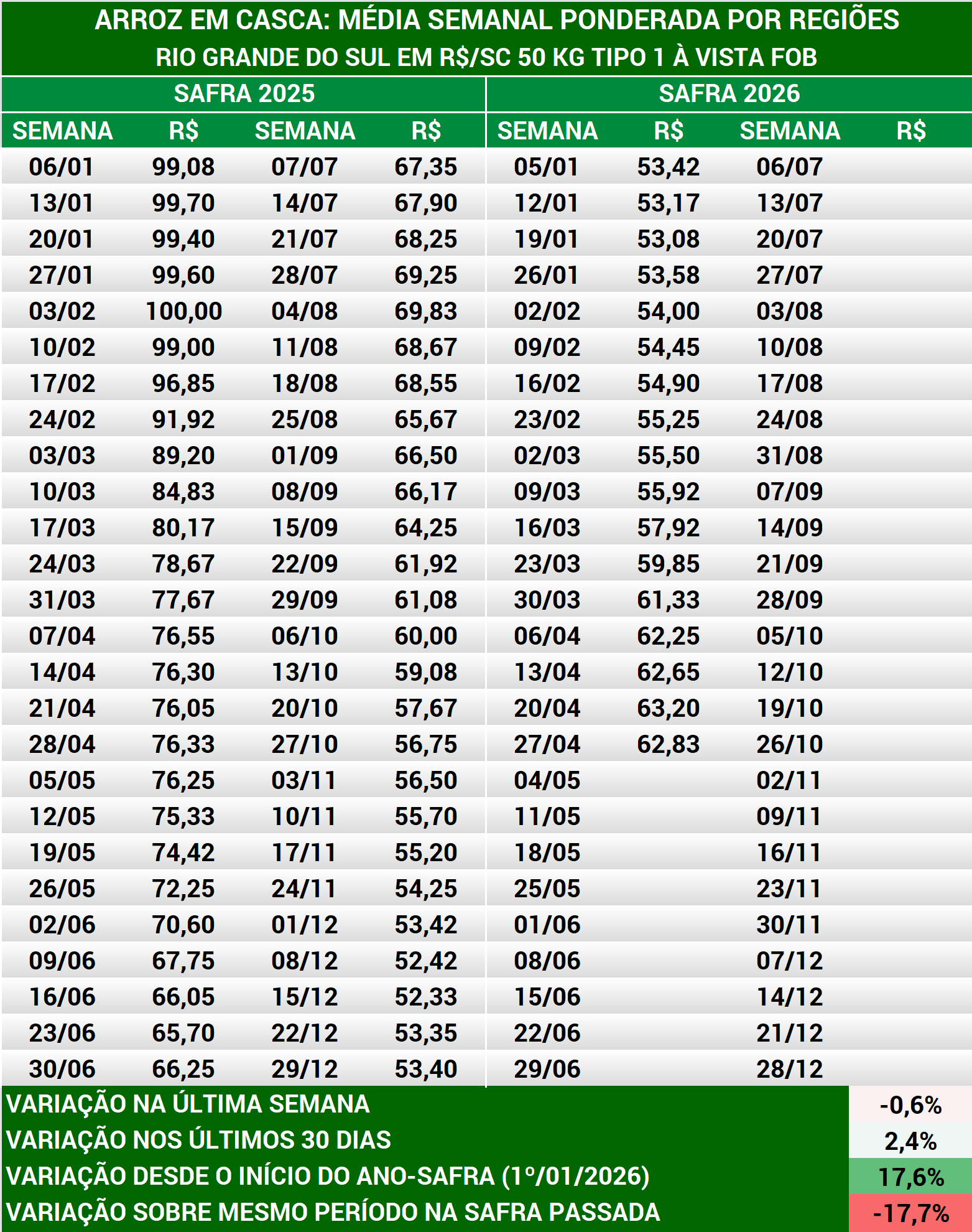 Arroz em casca: média semanal preços produtores