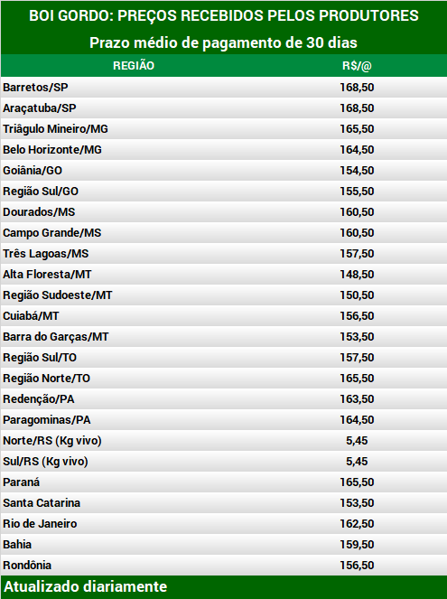 O cenário de exportações, que já se mostrou positivo, pode melhorar ainda mais caso novas unidades sejam habilitadas para a China, que precisa de proteína animal após ter o rebanho reduzido pela peste suína africana (PSA). Em São Paulo, o boi gordo está cotado a R$ 167,00 por arroba à vista e entre R$ 169,00 e R$ 174,00 por arroba a prazo. O avanço no Estado é sustentado pelo renovado apetite comprador de frigoríficos que correm para preencher suas escalas de abate, especialmente com foco em exportações.