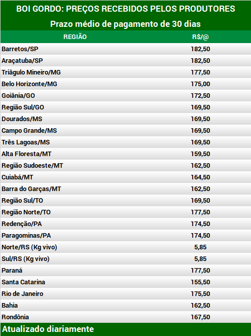 No Pará, o boi gordo está cotado entre R$ 172,00 e R$ 173,00 por arroba à vista e entre R$ 174,00 e R$ 175,00 por arroba a prazo. Em São Paulo, a cotação está entre R$ 178,50 e R$ 181,00 por arroba à vista e entre R$ 180,50 e R$ 182,00 por arroba. A falta de gado terminado está afetando, inclusive, o volume de exportação de carne bovina in natura. No atacado, o boi casado de animais castrados se mantém estável, a R$ 12,57 por Kg.