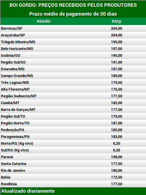 Os preços do boi gordo seguem firmes no mercado físico. Em novembro, a alta acumulada é de 12,9% na média das regiões pecuárias. Em São Paulo, o aumento é de 18% para o mesmo período. O boi gordo está cotado a R$ 202,00 por arroba à vista e entre R$ 204,00 e R$ 205,00 por arroba a prazo. Todas as regiões registram novo ajuste positivo, algo que não era visto desde 2004. As escalas de abate permanecem curtas e falhadas em muitas regiões do País.