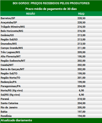 Em São Paulo, o boi gordo está cotado a R$ 226,50 por arroba à vista e entre R$ 228,50 e R$ 231,00 por arroba a prazo. Com as escalas de abate apertadas, não há espaço para recuo nas cotações. As programações de abate estão entre 3 e 4 dias úteis em algumas regiões do Estado. Em Mato Grosso, região que detém o maior rebanho de gado do País, as escalas de abate alcançaram a média de 5,4 dias úteis no acumulado de novembro, queda de 9,1% na variação mensal e o menor patamar do ano.