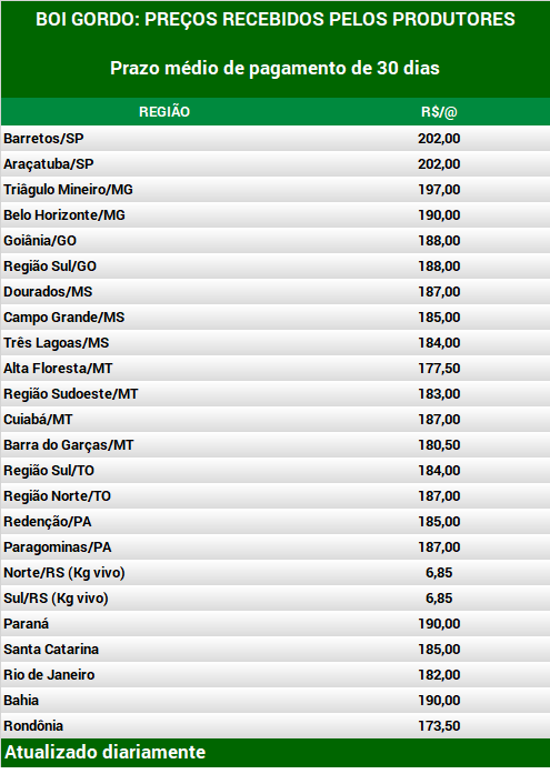 Os preços do boi gordo continuam firmes no mercado físico, em função da maior demanda dos frigoríficos por causa da expectativa de maiores vendas no Carnaval. Em Mato Grosso, o boi gordo registra alta de 5,39% nos últimos 30 dias; em Goiás, 5,79% e, em Tocantins, 8,36%. Em São Paulo, o avanço é de 4,66% no mês. Embora os embarques externos de carne bovina tenham arrefecido em janeiro de 2020 ante dezembro de 2019, as exportações ainda devem contribuir para sustentar preços no mercado doméstico. Em São Paulo, o boi gordo está cotado a R$ 200,00 por arroba à vista e a R$ 202,00 por arroba a prazo. Em Mato Grosso, a cotação está entre R$ 182,00 e R$ 183,00 por arroba à vista. Em São Paulo, no atacado, os preços se mantêm estáveis, com a carcaça casada de boi castrado sendo comercializado a R$ 13,24 por Kg.