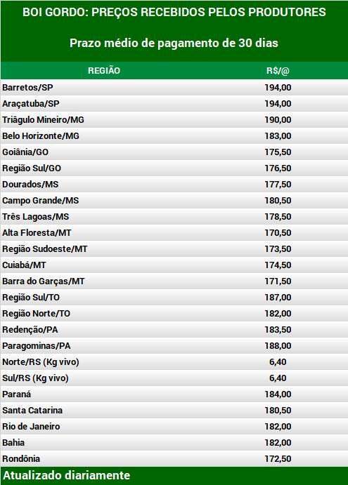 Em São Paulo, o boi gordo está cotado a R$ 192,00 por arroba à vista e a R$ 202,00 por arroba a prazo. Em Mato Grosso, a demanda por boiadas segue restrita, inclusive com plantas frigoríficas ainda fechadas por causa do coronavírus. Assim, o boi gordo está cotado entre R$ 169,00 e R$ 174,00 por arroba à vista e a R$ 177,00 por arroba a prazo. Em Goiás, a cotação é de R$ 173,50 por arroba à vista. Em Mato Grosso do Sul, o boi gordo está cotado a R$ 178,50 à vista. Em São Paulo, no atacado, o baixo escoamento da proteína mantém os preços estáveis. A carcaça casada de boi castrado está cotada a R$ 14,70 por Kg. A despeito das quedas acentuadas nos preços das carnes de frango e suína, a carne bovina continua com preços firmes.