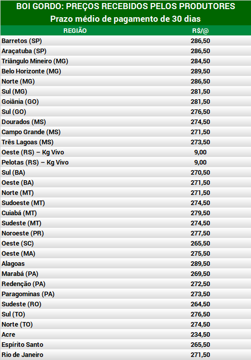 Em São Paulo, o boi gordo está cotado entre R$ 285,00 e R$ 287,00 por arroba à vista. Os bovinos mais jovens, que atendem às exigências para exportação, continuam cotados a R$ 290,00 por arroba. Em Mato Grosso, a cotação é de R$ 266,00 por arroba à vista e R$ 272,00 por arroba a prazo. No Rio Grande do Sul, a menor oferta de boi fez aumentar a procura por fêmeas. Assim, a vaca e a novilha gordas estão cotadas a R$ 8,50 e a R$ 8,70 por Kg, respectivamente.