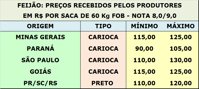 Em São Paulo, nesta segunda quinzena de fevereiro, os preços do feijão carioca ao produtor estão entre R$ 110,00 a R$ 130,00 por saca de 60 Kg para o produto de melhor qualidade, contra R$ 90,00 a R$ 110,00 por saca de 60 Kg na primeira quinzena deste mês. Em Minas Gerais e em Goiás, os preços pagos aos produtores para o feijão de melhor qualidade estão entre R$ 115,00 a R$ 125,00 por saca de 60 Kg, contra R$ 110,00 a R$ 120,00 por saca de 60 Kg na primeira quinzena de fevereiro. No mercado de feijão preto, nesta segunda quinzena de fevereiro, os preços aos produtores estão entre R$ 110,00 a R$ 120,00 por saca de 60 Kg, contra R$ 120,00 a R$ 140,00 na primeira quinzena do mês.