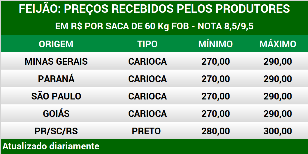 Os preços do feijão carioca se mantêm praticamente estáveis nas principais regiões produtoras. Os preços FOB produtor, de notas 8,5 a 9,5, oscilam em um intervalo entre R$ 270,00 e R$ 290,00 por saca de 60 Kg, ante R$ 250,00 e R$ 280,00 por saca de 60 Kg em maio. No atacado, permanecem inalterados. Os preços do feijão preto extra, FOB produtor, oscilam entre R$ 280,00 e R$ 300,00 por saca de 60 Kg, ante R$ 230,00 a R$ 260,00 por saca de 60 Kg no mês de maio.