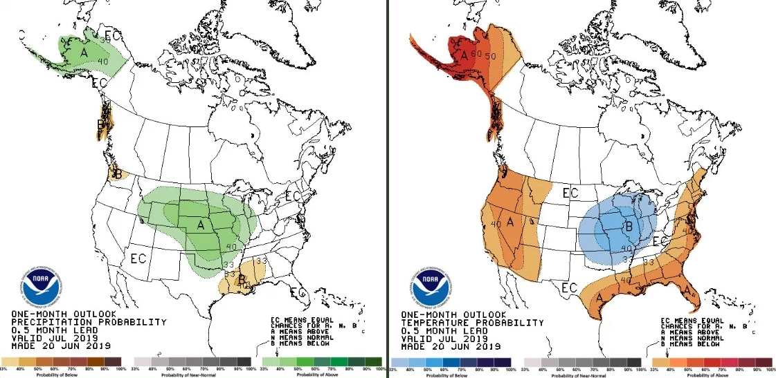 No último boletim semanal de acompanhamento de safras do Departamento de Agricultura dos Estados Unidos (USDA), dez estados norte-americanos indicaram uma piora nas condições de suas lavouras e a maior parte deles está na porção leste do cinturão, entre eles Missouri, Ohio, Indiana e Illinois. Em muitos campos, algumas lavouras ainda não germinaram e não irão polinizar até o final de agosto, e será um desafio para a safra amadurecer antes das primeiras geadas. No caso da soja, as condições melhores também são vistas mais a oeste do Corn Belt e os estados que têm as piores condições das plantações são observadas nos mesmos estados em que o milho registrou uma baixa nas condições. O desenvolvimento da soja também está bastante atrasado com 15% da área ainda não plantada, ou 4,8 milhões de hectares, com 29% ainda não germinado. Os mapas que trazem as previsões mais alongadas (imagem abaixo), no entanto, podem voltar a preocupar os produtores norte-americanos. No período de julho a setembro, de acordo com projeções do NOAA, boa parte do Corn Belt ainda pode com chuvas acima da média, principalmente a porção mais oeste do cinturão.