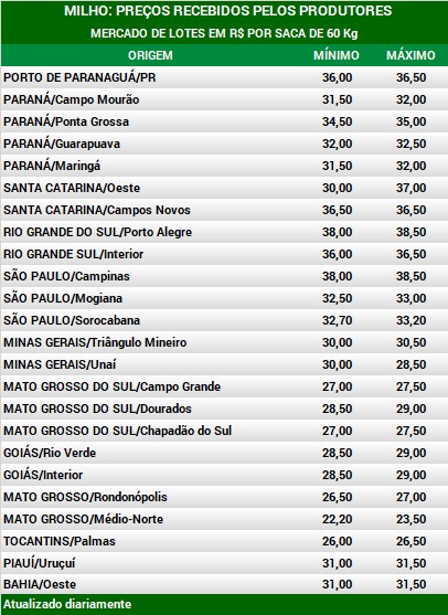 No Paraná, na região dos Campos Gerais, onde se colhe milho apenas na safra de verão, os vendedores que ainda possuem lotes acreditam que os preços vão subir e adiam a negociação. Os preços remuneradores da soja também incentivam produtores a privilegiar a comercialização da oleaginosa. Os exportadores indicam R$ 36,50 por saca de 60 Kg CIF, para entrega no Porto de Paranaguá em outubro e pagamento em novembro, o que equivale a entre R$ 32,00 e R$ 33,00 por saca de 60 Kg FOB em Ponta Grossa. Os vendedores estão retraídos.