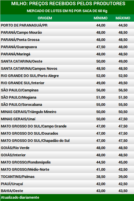 No Paraná, na região dos Campos Gerais, há registro de negócios a R$ 48,00 por saca de 60 Kg, para retirada imediata e pagamento em 30 dias. A alta de preço está relacionada à baixa disponibilidade e à preocupação com o clima seco em áreas produtoras de 2ª safra no Estado, o que pode afetar a produção. Também há registro de negócios a R$ 49,00 por saca de 60 Kg, para entrega no fim de abril e pagamento em maio. O mesmo valor é indicado por alguns compradores para entrega em junho e pagamento em julho. Na região norte do Paraná, as ofertas são escassas porque quase não há mais milho da 2ª safra de 2019 em estoque e a região enfrenta falta de chuva para as lavouras da 2ª safra de 2020. A indicação de compra está entre R$ 50,00 e R$ 51,00 por saca de 60 Kg CIF na região.
