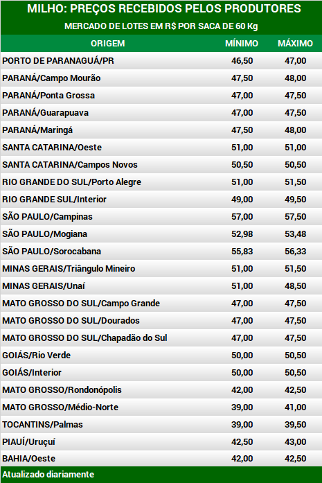 No Paraná, na região dos Campos Gerais, há registro de negócios pontuais a R$ 47,00 por saca de 60 Kg, para embarque em abril e pagamento no fim do mesmo mês ou R$ 46,00 por saca de 60 Kg no spot, para pagamento contra a retirada. Os preços se mantêm estáveis. O Paraná é um grande consumidor, mas também um grande produtor e tem milho suficiente. Já o Rio Grande do Sul não tem muito milho, por isso os preços estão mais altos.