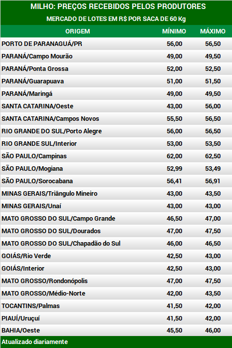 Os preços do milho seguem sustentados no Brasil. Em Mato Grosso, os compradores mantêm suas indicações. Na Região Sul, os preços registram alta pela necessidade de compra. A oferta segue restrita nas diversas localidades e, no Paraná, quem aguardava maior disponibilidade do cereal da 2ª safra de 2020 não está encontrando produto na quantidade esperada, em virtude da sequência de dias de chuva que atrapalhou a colheita. Em Mato Grosso, na região de Campo Verde, os compradores de milho mantêm suas indicações em torno de R$ 45,00 por saca de 60 Kg FOB, para retirada imediata e pagamento no curto prazo, sem interesse de venda. Há também indicação de compra a R$ 48,00 por saca de 60 Kg, para embarque e pagamento em dezembro, mas também não interessou aos vendedores. O produtor está já tem muito produto vendido para embarcar até dezembro.