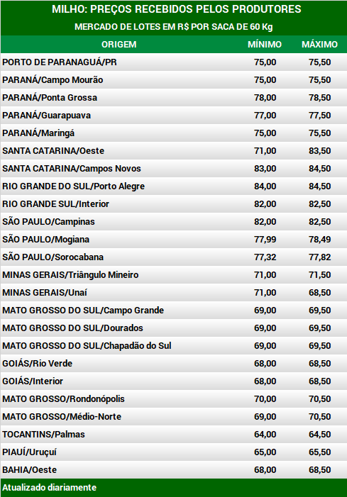 Em Mato Grosso, na região de Campo Verde, a negociação está avançando no disponível para exportação e consumo interno. Há registro de negócios entre R$ 67,00 e R$ 68,00 por saca de 60 Kg, para retirada e pagamento imediatos. Ainda há lotes por serem desovados antes da chegada da soja. As cotações se mantêm estáveis nos últimos sete dias, mas estão abaixo dos picos de preço recentes, observados há cerca de um mês e meio, quando o milho chegou a R$ 72,00 por saca de 60 Kg.