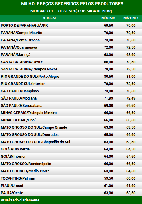 Em Mato Grosso do Sul, são raros os produtores que aceitam negociar no mercado de lotes. Na região de Dourados, os compradores do mercado interno indicam R$ 66,00 por saca de 60 Kg FOB no spot. A oferta ocorre por causa da aproximação da colheita de soja e da necessidade de abrir espaço em armazéns para o grão. Os produtores têm expectativa de alta, por causa do clima, de quebras no Rio Grande do Sul e Santa Catarina e de mais informações sobre a safra.