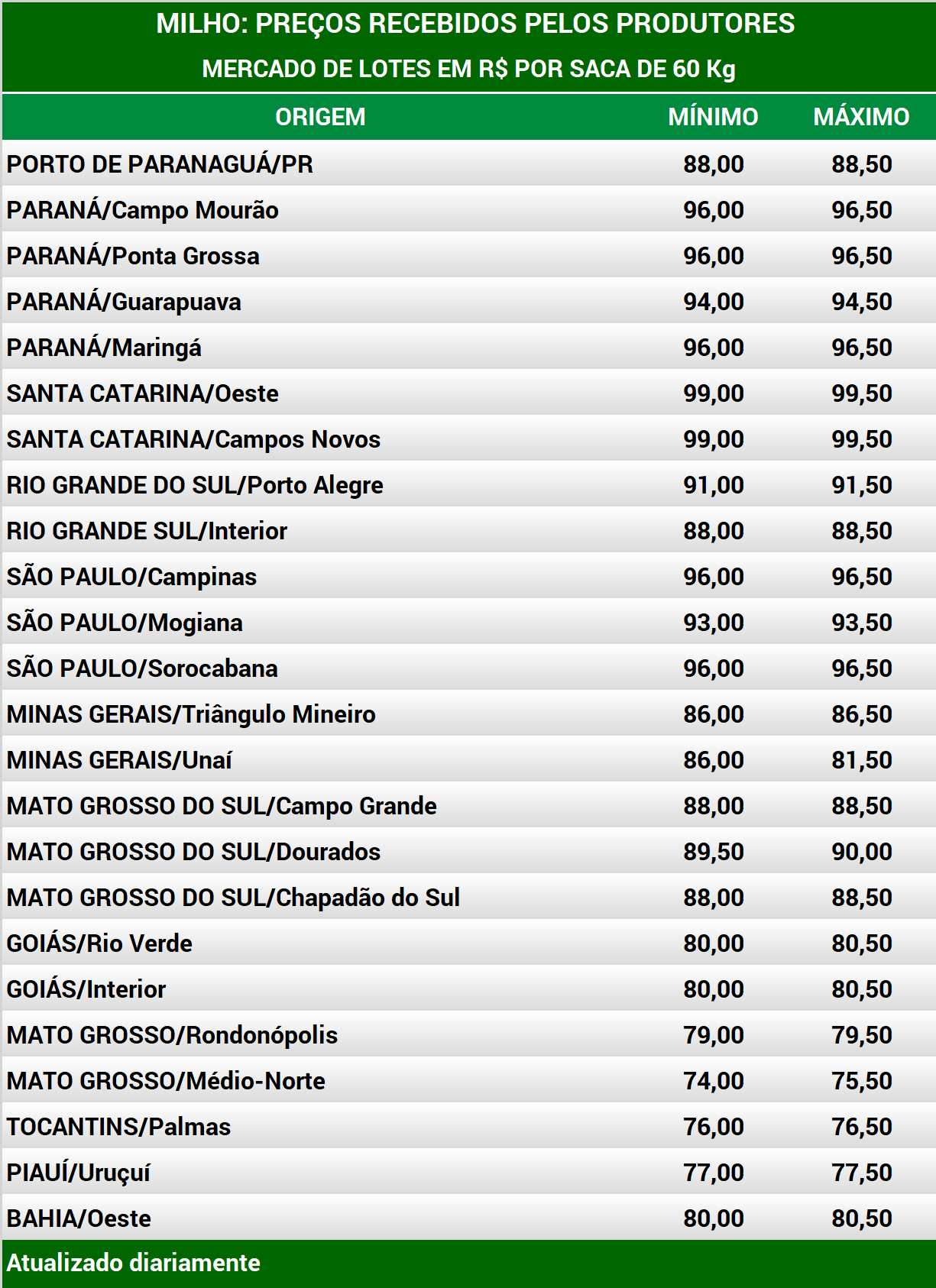 Em Mato Grosso do Sul, na região de Dourados, os consumidores domésticos, principalmente confinamentos e empresas do próprio Estado, mantêm a indicação a R$ 90,00 por saca de 60 Kg, para retirada imediata e pagamento em 30 dias, mas a perspectiva de mais perdas decorrentes das geadas mantém os produtores retraídos. A comercialização da 2ª safra de 2022, tampouco avança. Os prejuízos provocados pelo clima na safra atual desestimulam produtores a negociar a produção do ano que vem.