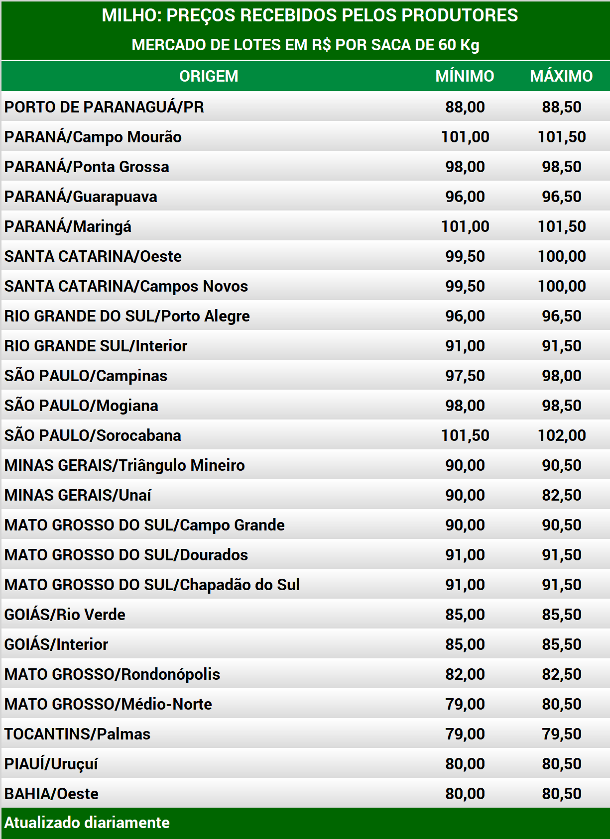 No Paraná, os vendedores estão retraídos com a nova ocorrência de geada. Eles estão avaliando o impacto sobre rendimento e qualidade antes de fechar novos negócios por receio de não conseguir cumprir contratos. No Porto de Paranaguá, a indicação é de R$ 79,00 por saca de 60 Kg, para entrega em agosto. Na região norte, os compradores indicam R$ 98,00 por saca de 60 Kg no spot. Na região oeste, a indicação de compra é de R$ 98,00 por saca de 60 Kg, para retirada imediata e pagamento no fim de julho. Posto nos terminais ferroviários da região norte do Paraná, os compradores indicam R$ 73,00 por saca de 60 Kg, para entrega em agosto. A negociação já vinha lenta no fim da semana passada e perdeu ainda mais força após a nova ocorrência de geadas no Paraná. Os compradores aguardam novos washouts de contratos de exportação por parte de tradings, que desovariam esse milho no mercado interno, e já voltaram a importar da Argentina. Para a 2ª safra de 2022, a indicação de compra é de R$ 73,00 por saca de 60 Kg, para entrega em julho do ano que vem no Porto de Paranaguá. Na região norte, a indicação de compradores é de R$ 72,00 por saca de 60 Kg, para retirada em julho ou agosto.