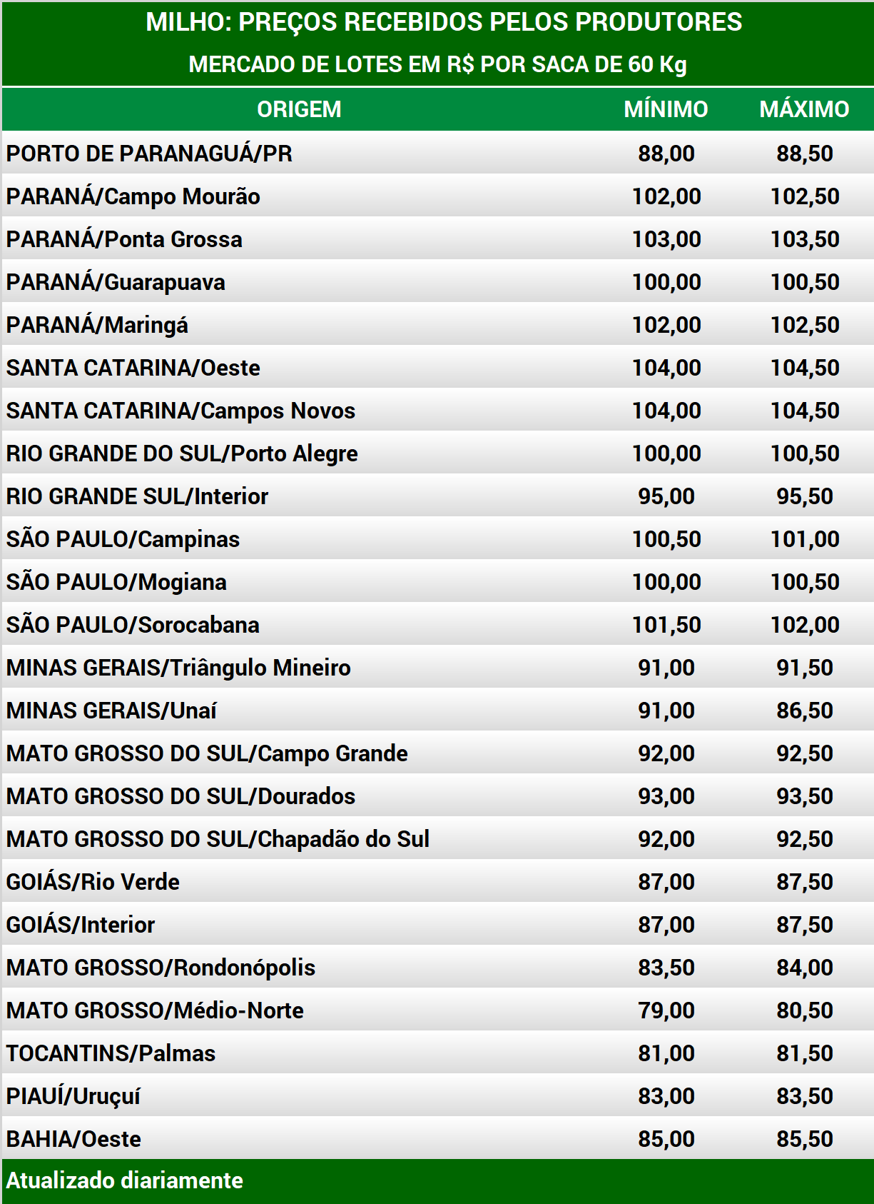 No Paraná, na região norte, há registro de negócios a R$ 97,50 por saca de 60 Kg mais ICMS com cereal vindo de Goiás, para entrega imediata e pagamento em 30 dias. Os consumidores do Paraná estão se abastecendo com milho de outros Estados porque a safra local não deve ser suficiente para suprir a necessidade. Deve chegar milho argentino esta semana a R$ 97,00 por saca de 60 Kg, para retirada no Porto de Imbituba (SC), para abastecer fábricas de Santa Catarina e do Rio Grande do Sul. Os compradores do Paraná estão recorrendo ao milho de Mato Grosso, mas, embora haja disponibilidade de volume, a qualidade tem sido uma incógnita, uma vez que o Estado também teve problemas climáticos durante a temporada. Na região dos Campos Gerais, a indicação de compra é de R$ 100,00 por saca de 60 Kg no spot. Quanto à 2ª safra de 2022, os compradores indicam R$ 75,00 por saca de 60 Kg, para retirada no norte do Paraná em agosto do ano que vem e pagamento no mês seguinte. Contudo, não surgem ofertas.